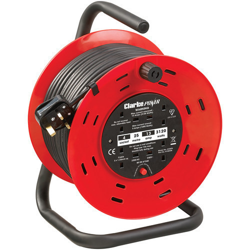 Robust polypropylene 25m cable reel with 4 socket outlets and thermal cut out. Perfect for trade or home use.