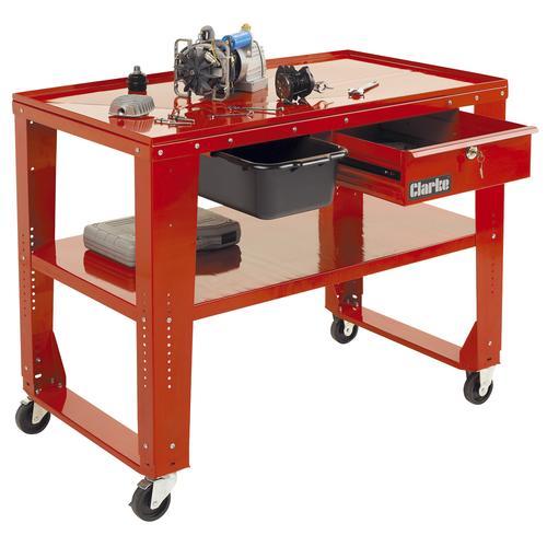 A valuable addition to any garage workshop, this mobile work table is perfect for stripping and repairing small engines, transmissions and parts. And, for real convenience, the table has grooves and raised edges with a built in drain and removable collection tray for easy drainage of oil, lubricants and transmission fluids for a cleaner work environment.
