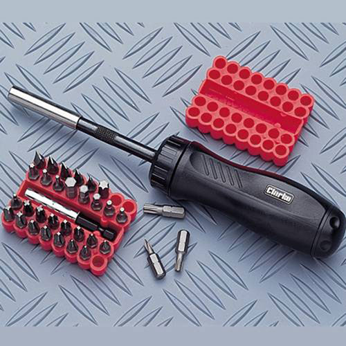 A unique screwdriver plus bits set with easy twist action drive in one direction (comparable to a ratchet but only minimal turning movement is required to operate). No need to alter hand grip, especially helpful in confined space or where access is limited