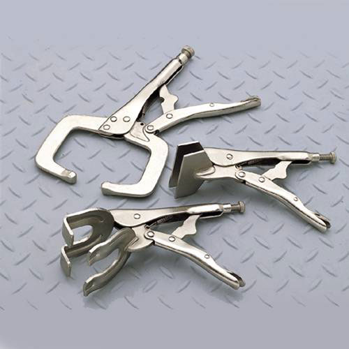 A set of 3 general purpose locking clamps for holding metal securely in position prior to welding. Three different configurations to deal with most common situations. Use additional sets for larger structures.
