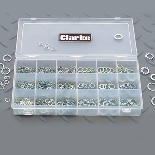 An assortment of 720 securing washers including split/spring, star, external & land shakeproof all neatly presented in an 18 compartment translucent storage box.