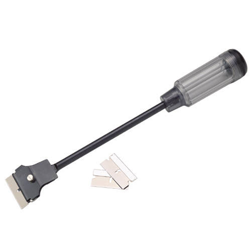 Universal razor edge scraper for removing stubborn gaskets, stickers, labels, adhesive etc from smooth surfaces.