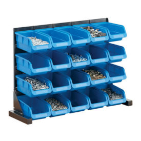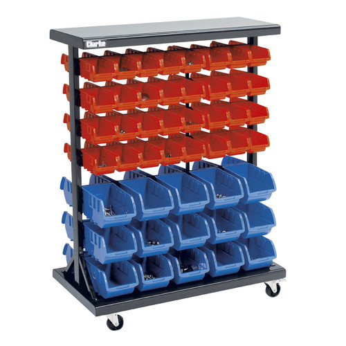 Ideal for garages and workshops, keeping working areas free of clutter. Mounted on four heavy-duty castors (two lockable) for easy movement. Complete with 64 small red bins and 30 large blue bins.