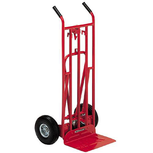 This heavy duty truck can be quickly adapted to a horizontal, 3-wheeled unit which helps support the load whilst in transit.