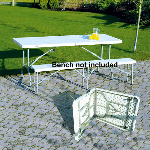 A high density polyethylene and metal frame furniture, with folding legs. This 6ft long table (HDT1830) folds in half and has a carry handle for easy transportation. Perfect for use in community halls, for sports & leisure events and activities, camping. Ideal for canteens, outside catering events and home & office use too.