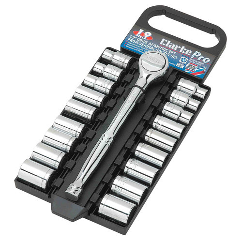 Contents: 1 x Ratchet (250mm length, 18 x 1/2 Drive Sockets: 10, 11, 13, 14, 15, 17, 19, 21, 22mm & 3/8, 7/16, ½, 9/16, 5/8, 11/16, ¾, 13/16, 7/8