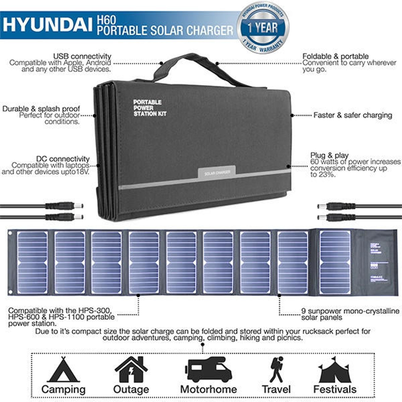 The H60 is a foldable solar charger from Hyundai, featuring plug and play technology the H60 recharges your on the go home essentials anytime, anywhere via DC TO DC cable or USB. The H60 allows you to free yourself from the wall and stay powered wherever you go using the sun’s energy.