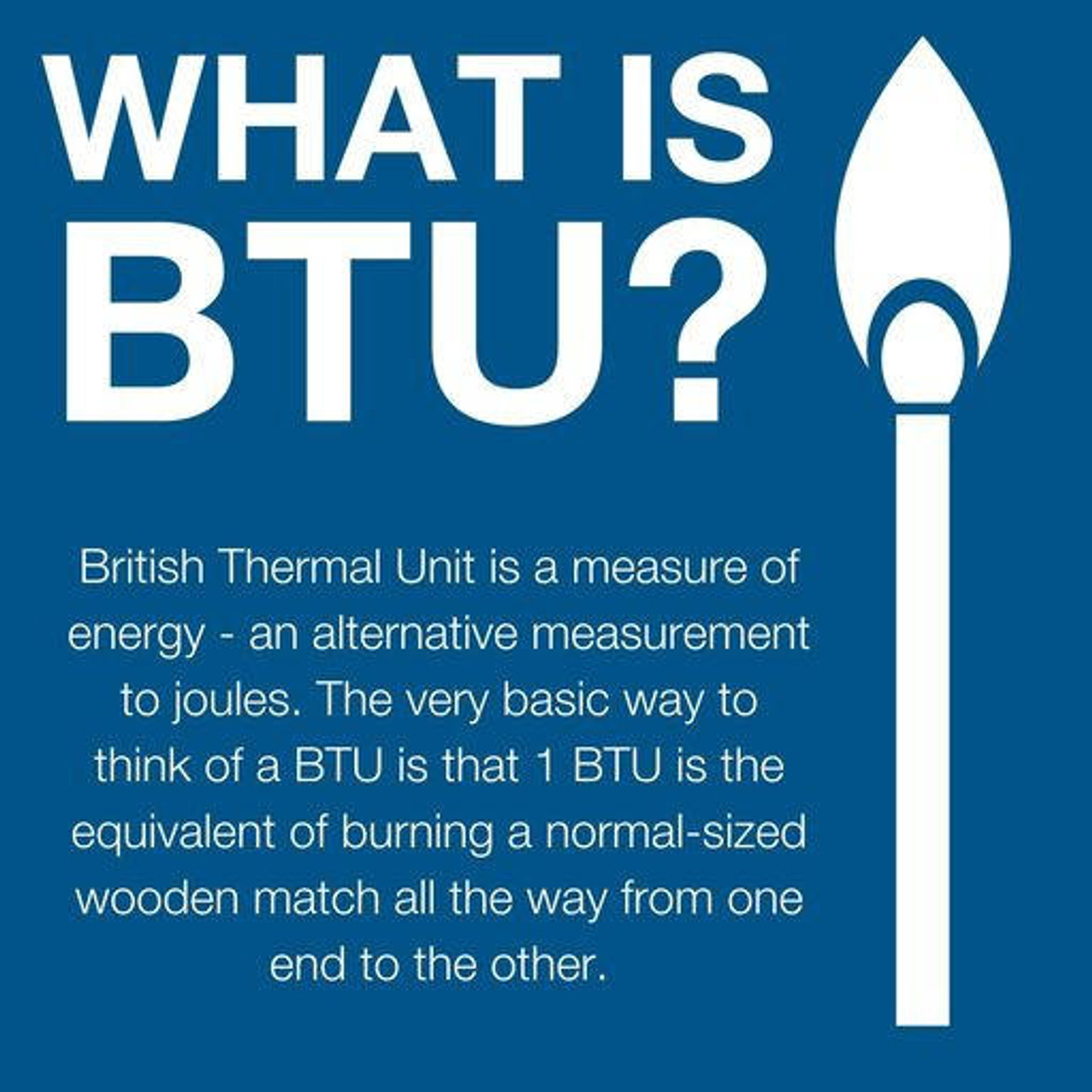 BTU, or, British Thermal Unit is a measure of energy – an alternative measurement to joules. The very basic way to think of a BTU is that 1 BTU is the equivalent of burning a normal-sized wooden match all the way from one end to the other.