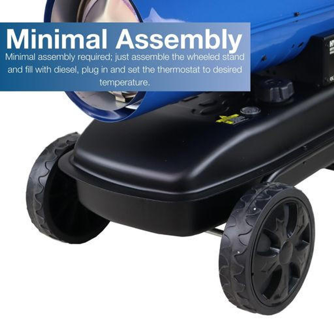 Minimal assembly required; just assemble the wheeled stand and fill with diesel, plug in and set the thermostat to desired temperature.