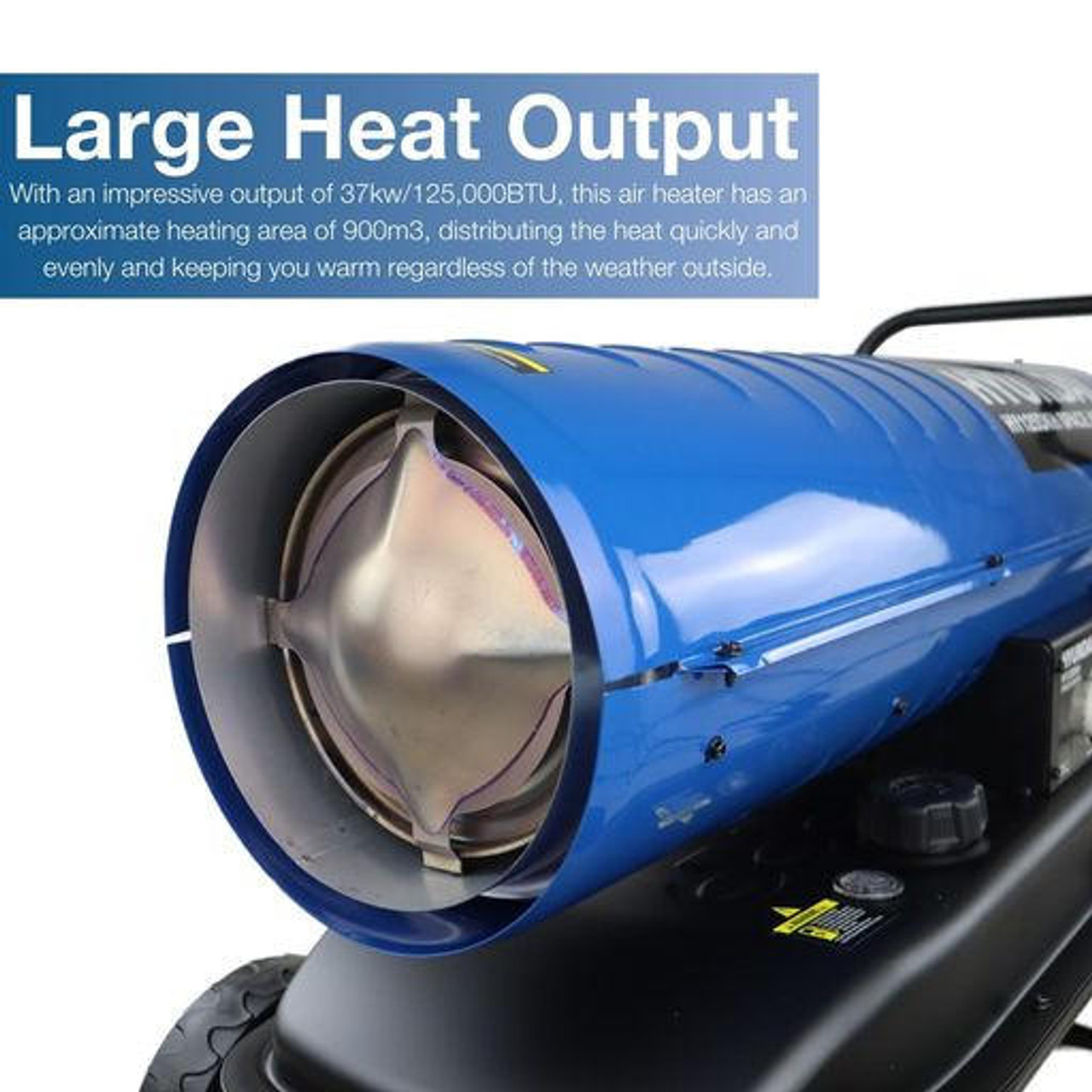 With an impressive output of 37kw/125,000BTU, this air heater has an approximate heating area of 900m3 (31,783 cubic feet), distributing the heat quickly and evenly and keeping you warm regardless of the weather outside.
