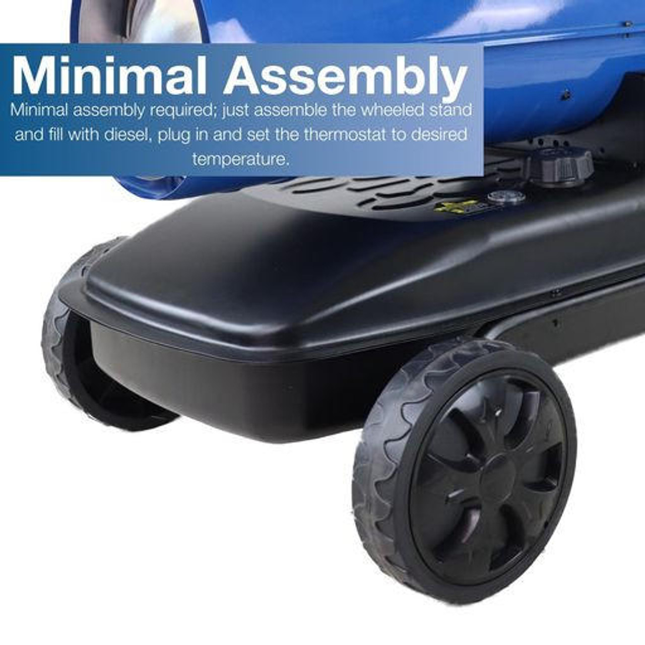 Minimal assembly required; just assemble the wheeled stand and fill with diesel, plug in and set the thermostat to desired temperature.