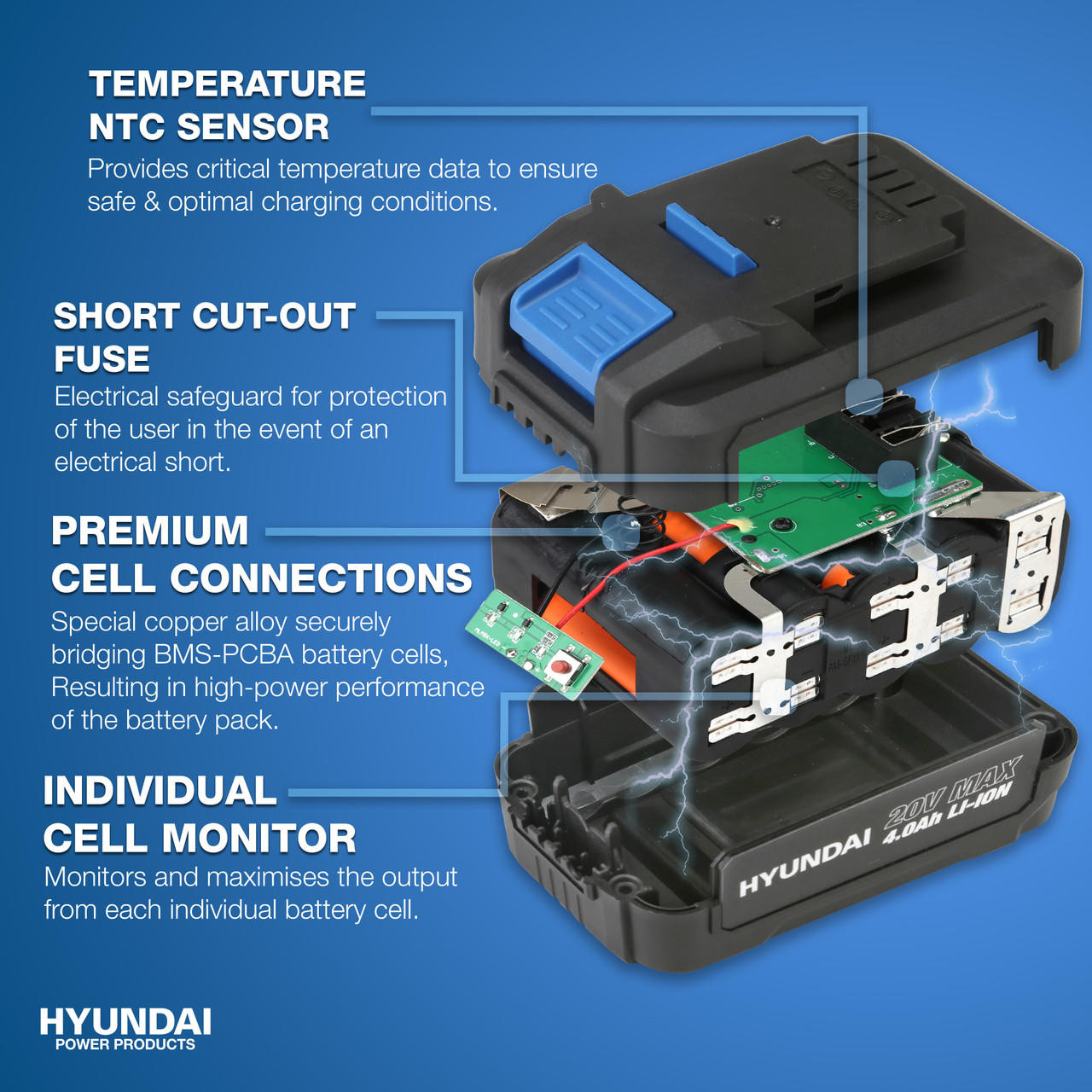- Interchangeable battery: Power the whole Hyundai 20v garden machinery and power tool range from the same battery