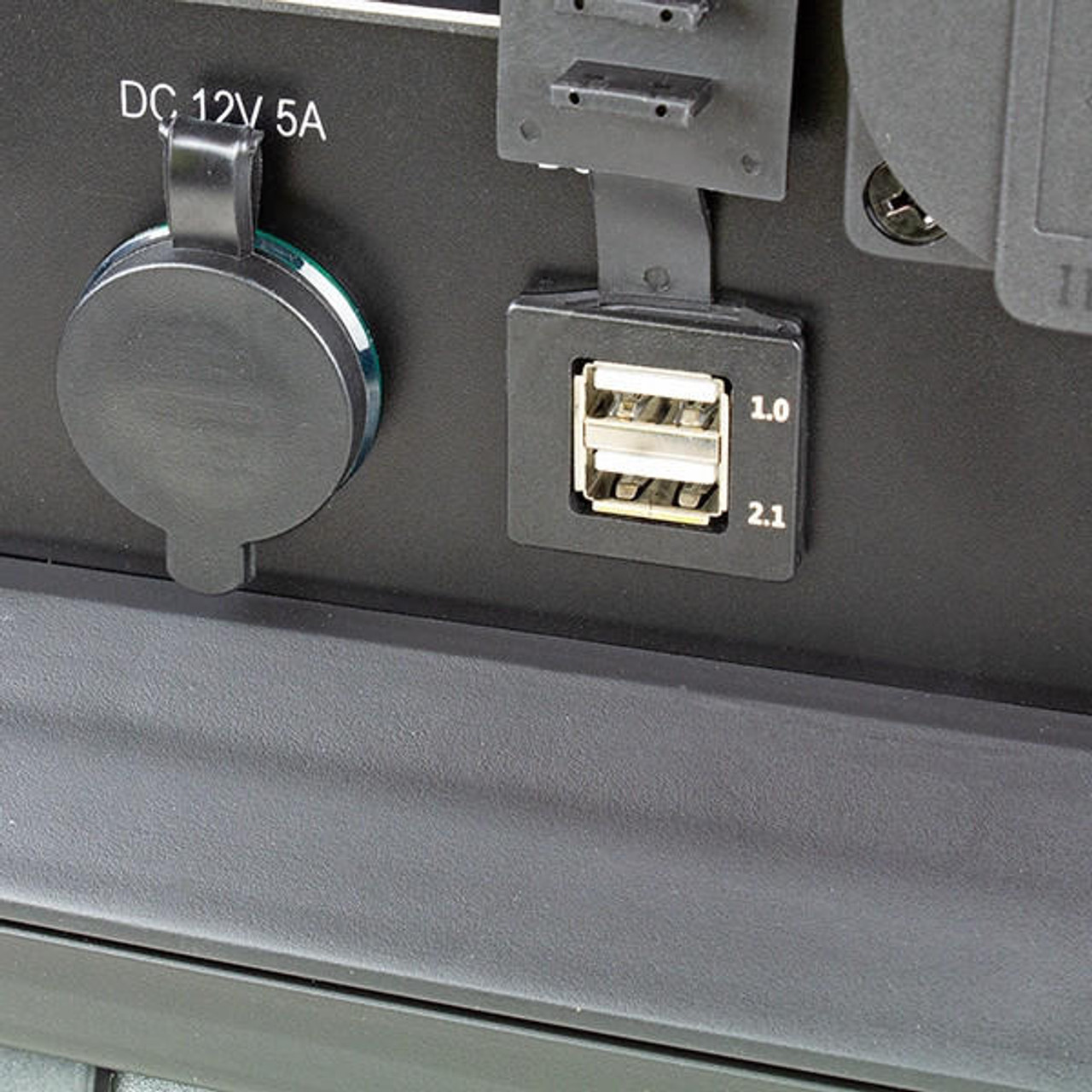 The control panel features two 230v sockets for use with any appliances which use a standard 3-pin 13A UK mains plug, as well as a 32A 230v socket, 12v 5A outlet, and 12v DC battery charging outlet, allowing you to power multiple things at the same time, such as a heater, kettle and fridge.