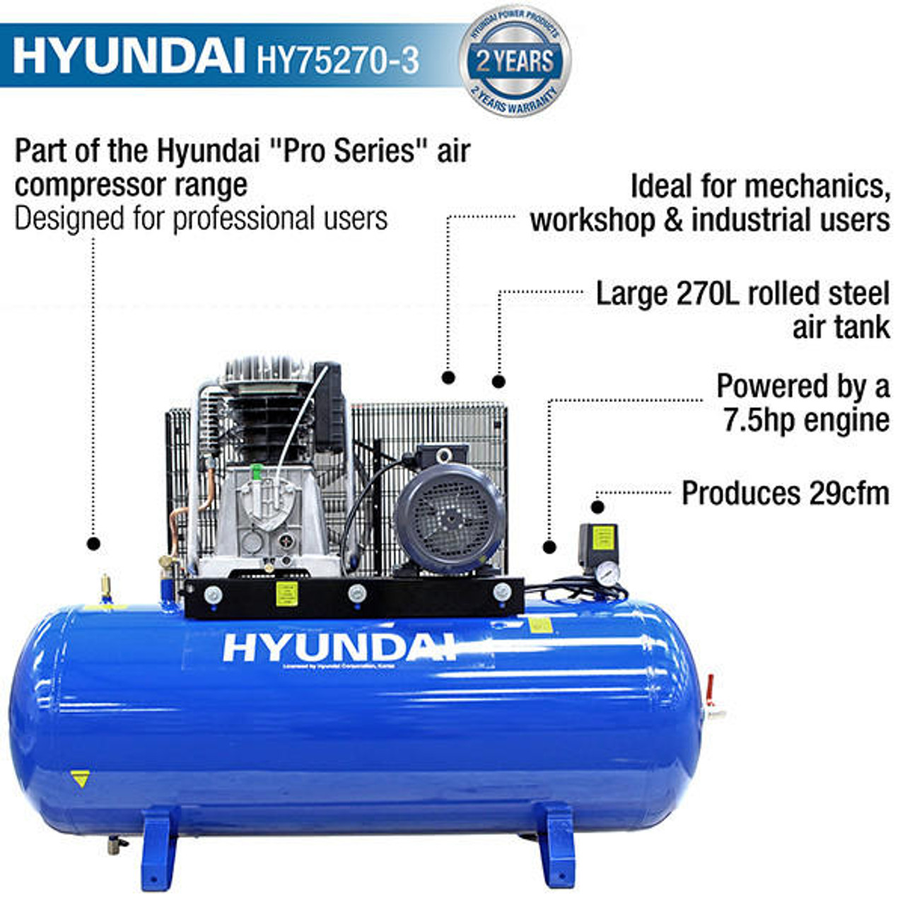 Hyundai HY75270-3 270 Litre Air Compressor 21CFM/145psi 3-Phase Pro-series 7.5hp