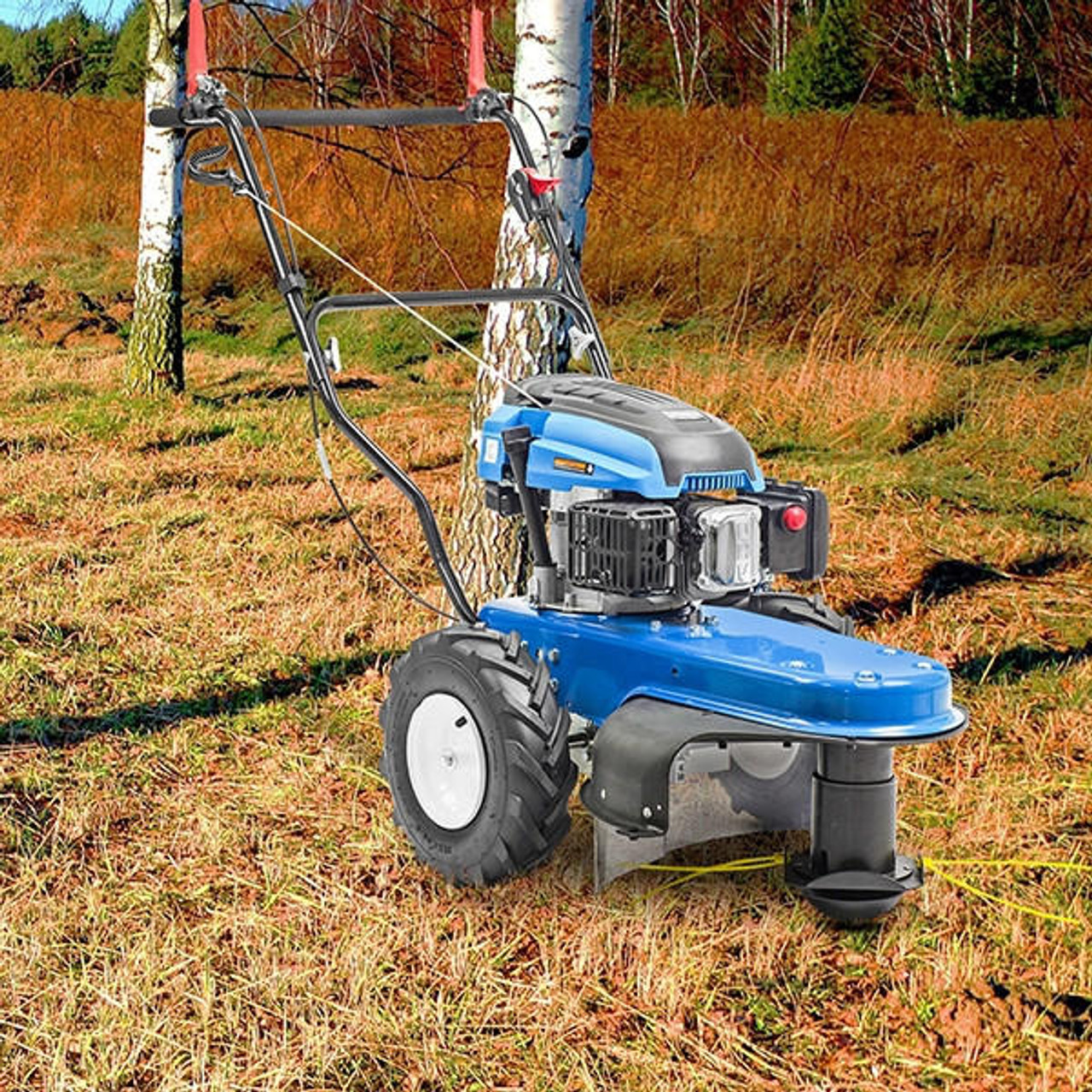 - Wheeled petrol grass trimmer suitable for level, sloping and uneven ground