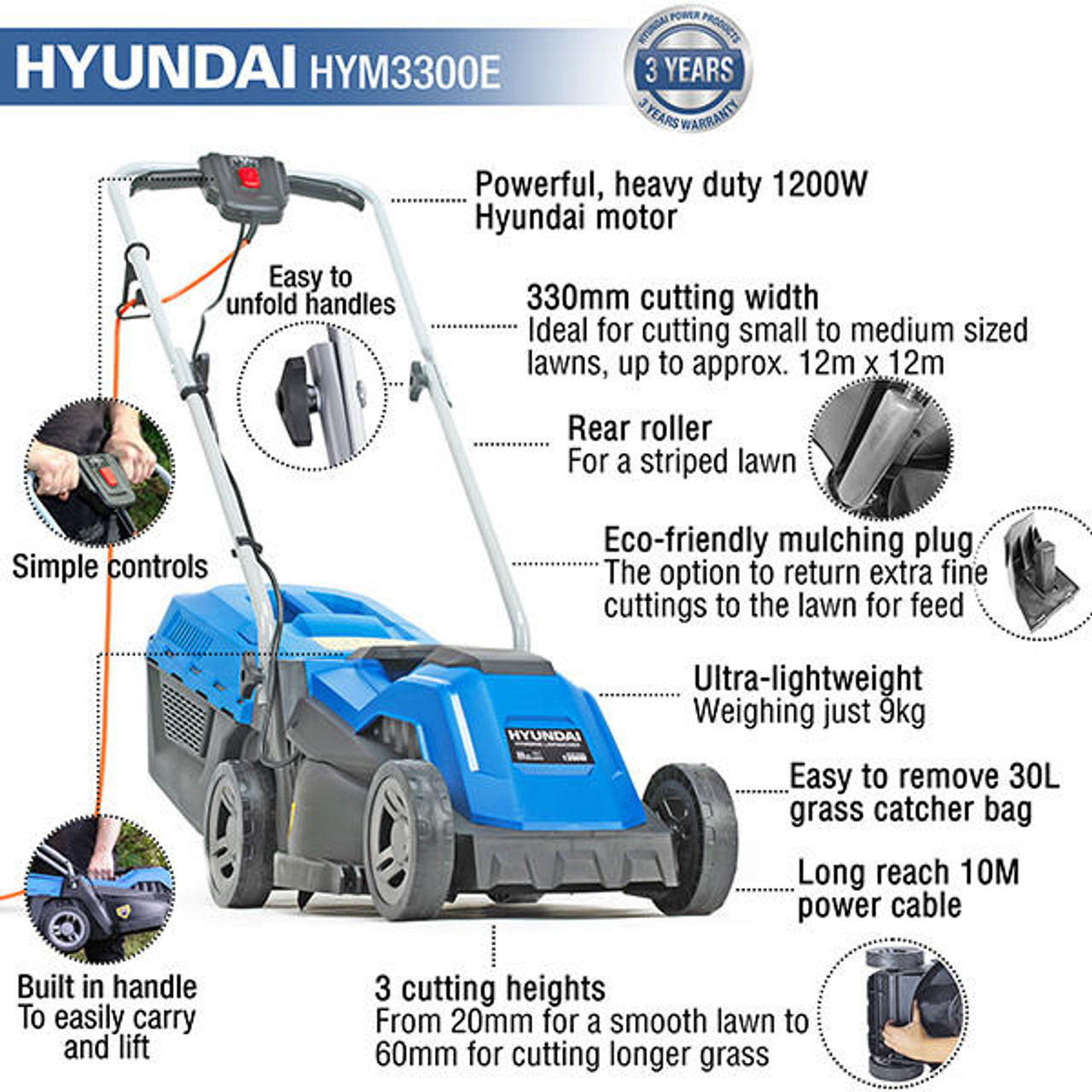 As with all of our Hyundai Lawn Mowers, this corded electric mower has a 3 year platinum Hyundai warranty* (terms apply) for added peace of mind.