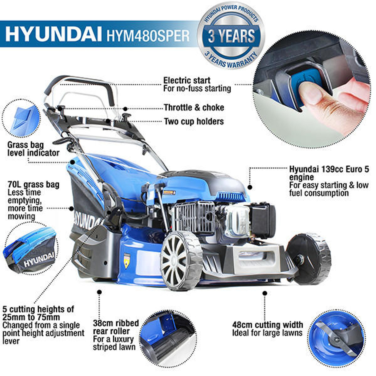 The Hyundai HYM480SPER lawn mower is powered by an impressive Hyundai 139cc / 3.7hp OHV economical petrol 4-stroke engine for quick and efficient cutting.