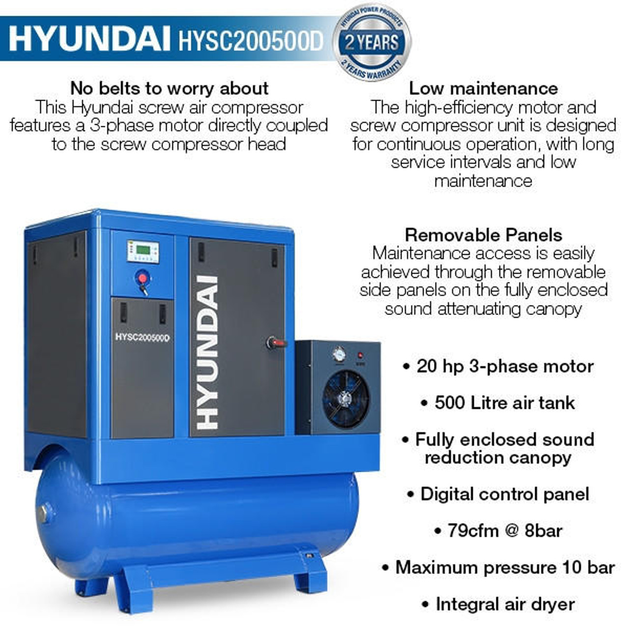 Hyundai HYSC200500D 20hp 500 Litre Industrial Screw Compressor with Dryer