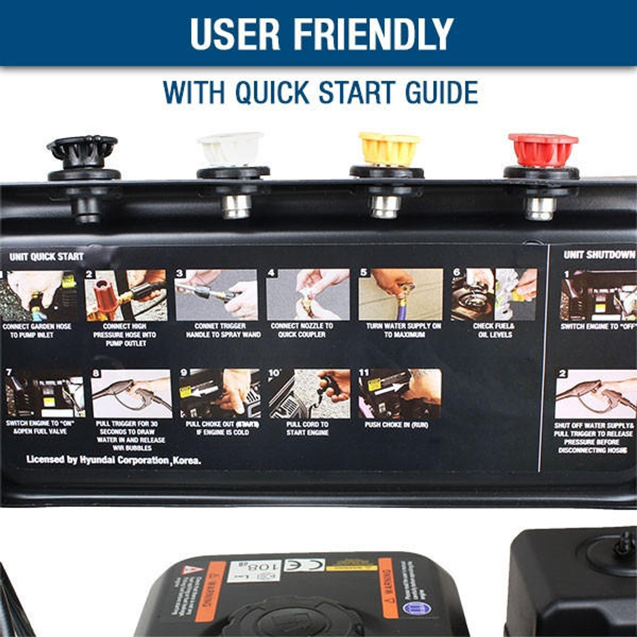 The Hyundai 212cc 4 stroke petrol engine has tremendous mid range torque so the jet washer does not have to be operated at maximum revs while cleaning. This makes for a more pleasant, quieter user experience and reduces fuel consumption, whilst promoting long engine life.