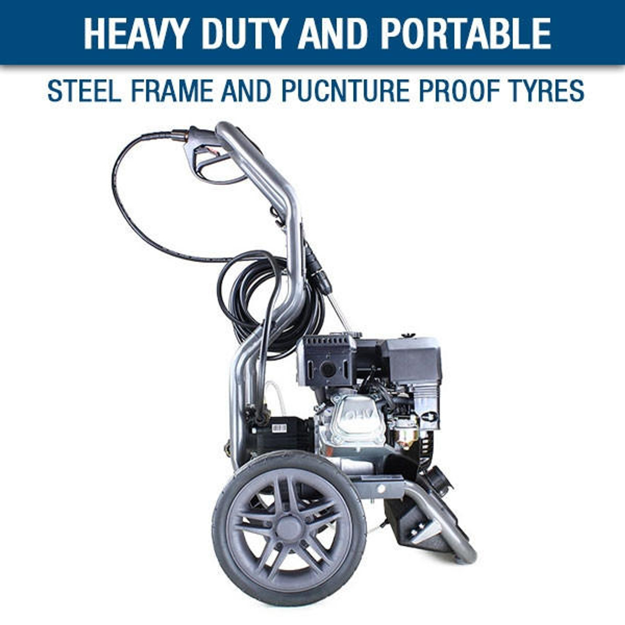 It’s also fitted with tough puncture proof tyres for easy movement across rough terrain, which makes this a truly portable pressure washer.