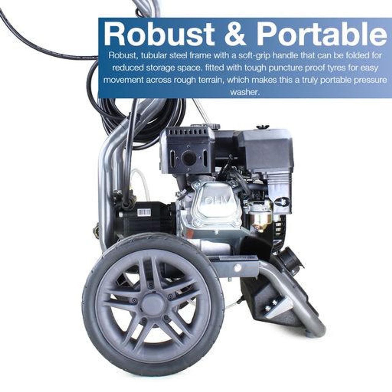 Portable pressure washer: Fitted with puncture-proof wheels for easy mobility