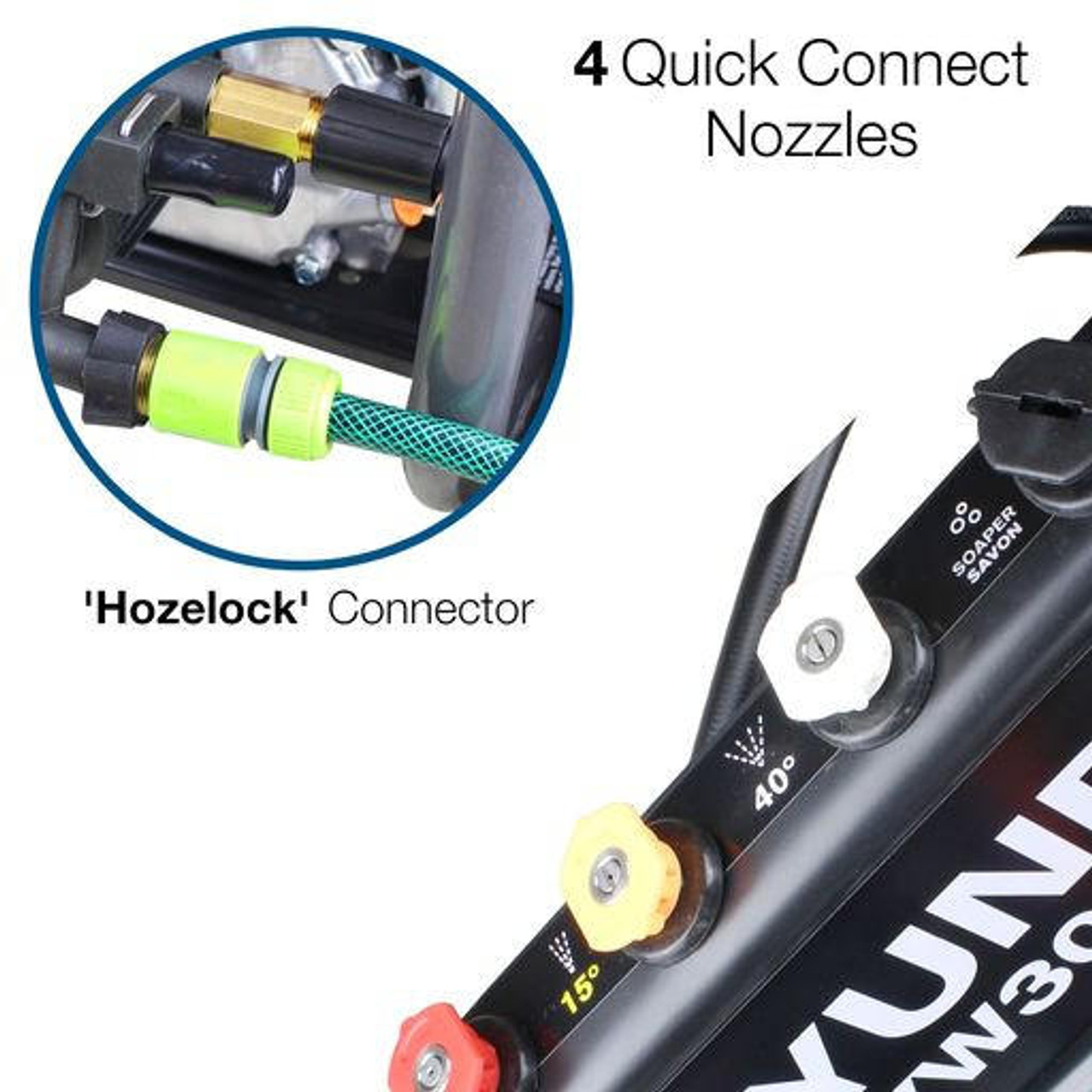 The 4 quick connect nozzles (0, 15, 40 and standard low pressure detergent spray nozzle) can be changed quickly and effortlessly by sliding the outer collar back on the Q/R connector on the lance.