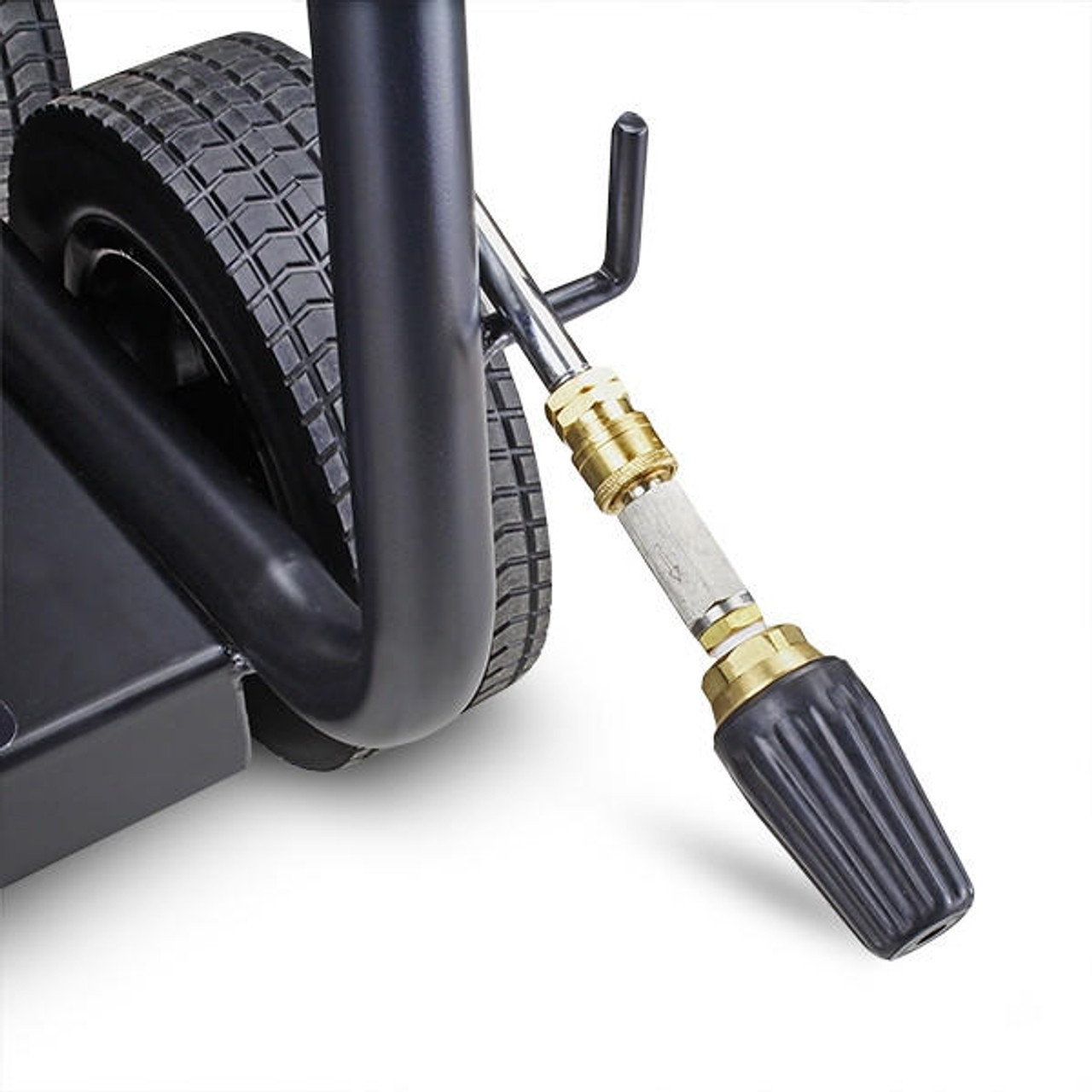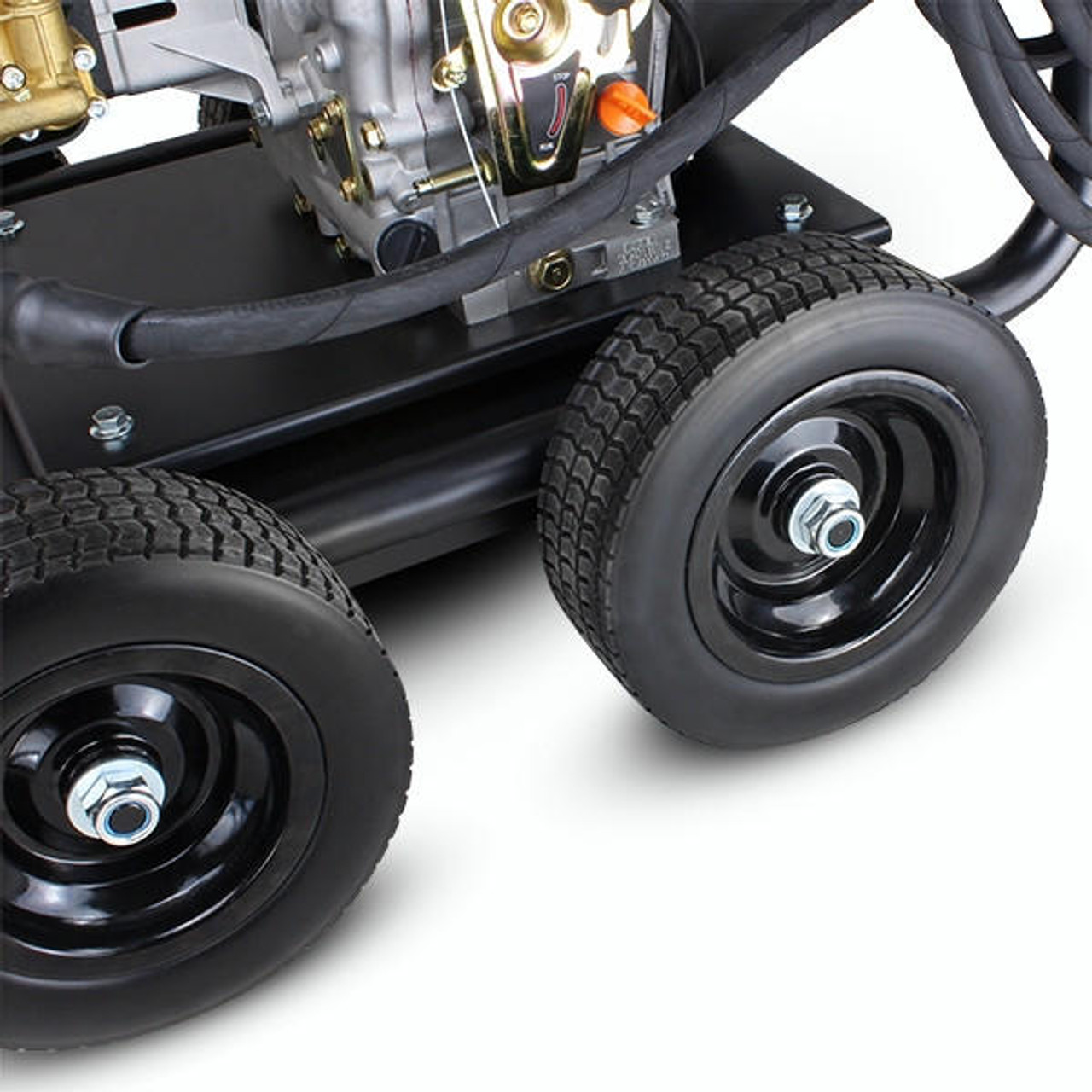 Fitted with four wide, large-diameter foam-filled puncture-proof tyres, these make this powerful diesel pressure washer very easy to move around, especially across rough and difficult terrain such as muddy fields and stone driveways.