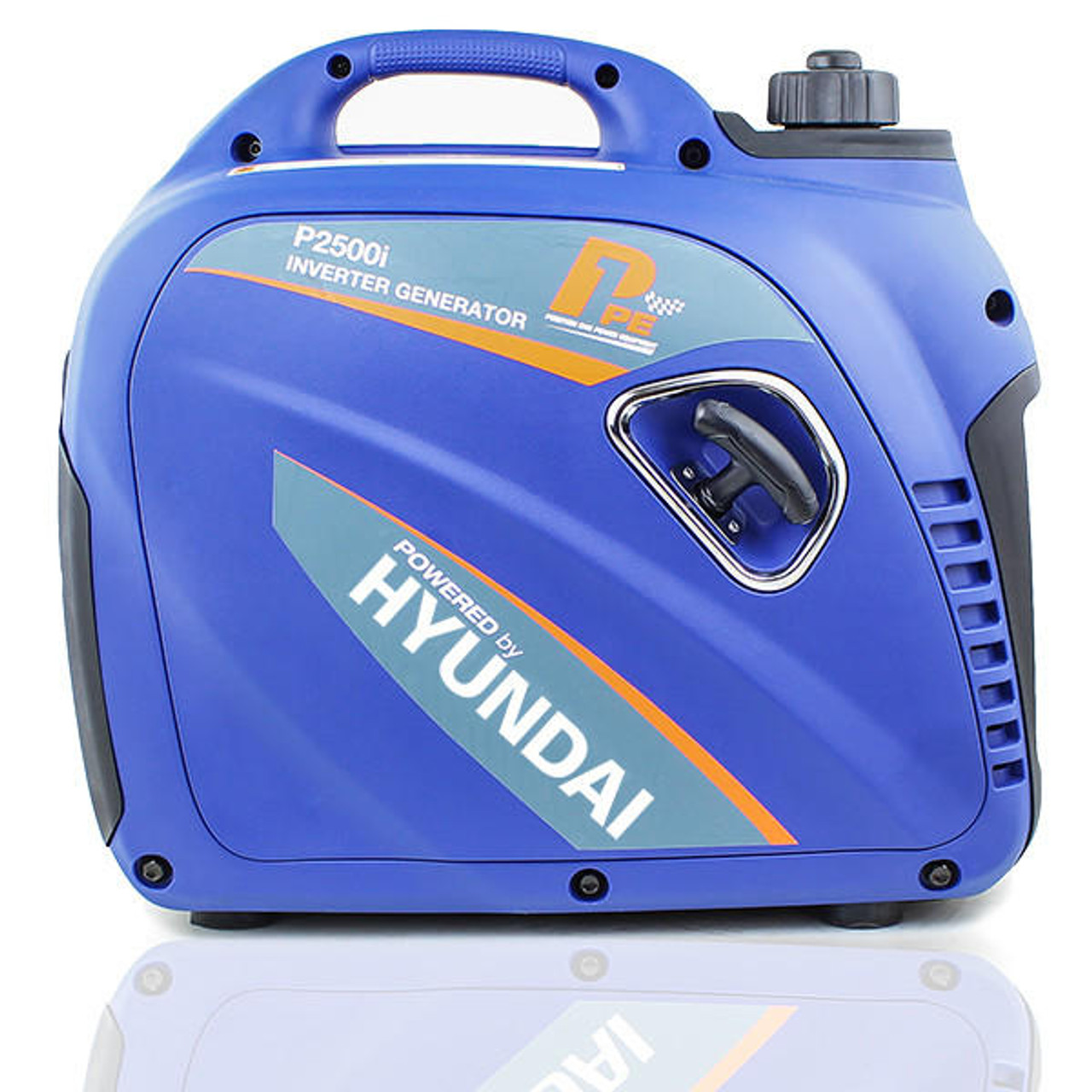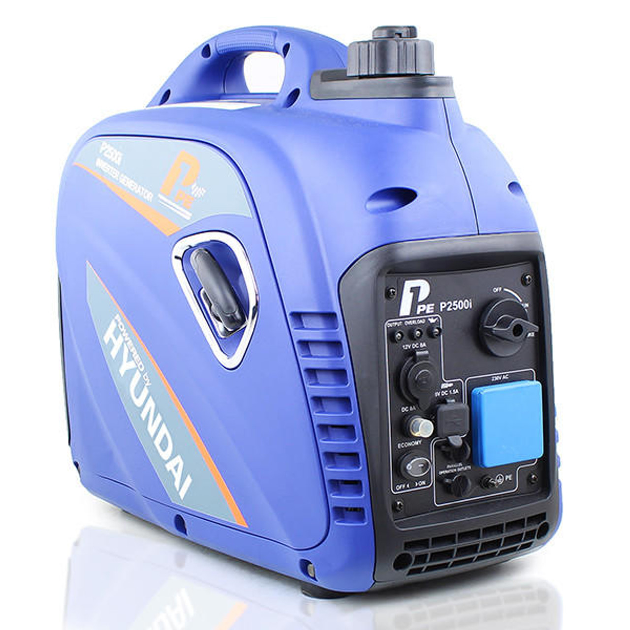 Powered by a 98cc 4-stroke easy-start recoil Hyundai petrol engine, the P2500i is able to produce up to 2200w / 2.2kW and is more than capable of powering televisions, small heaters, fridges, small kettles, microwaves, air conditioning, small air pumps for inflatable beds, laptops, phone chargers, lights, etc.