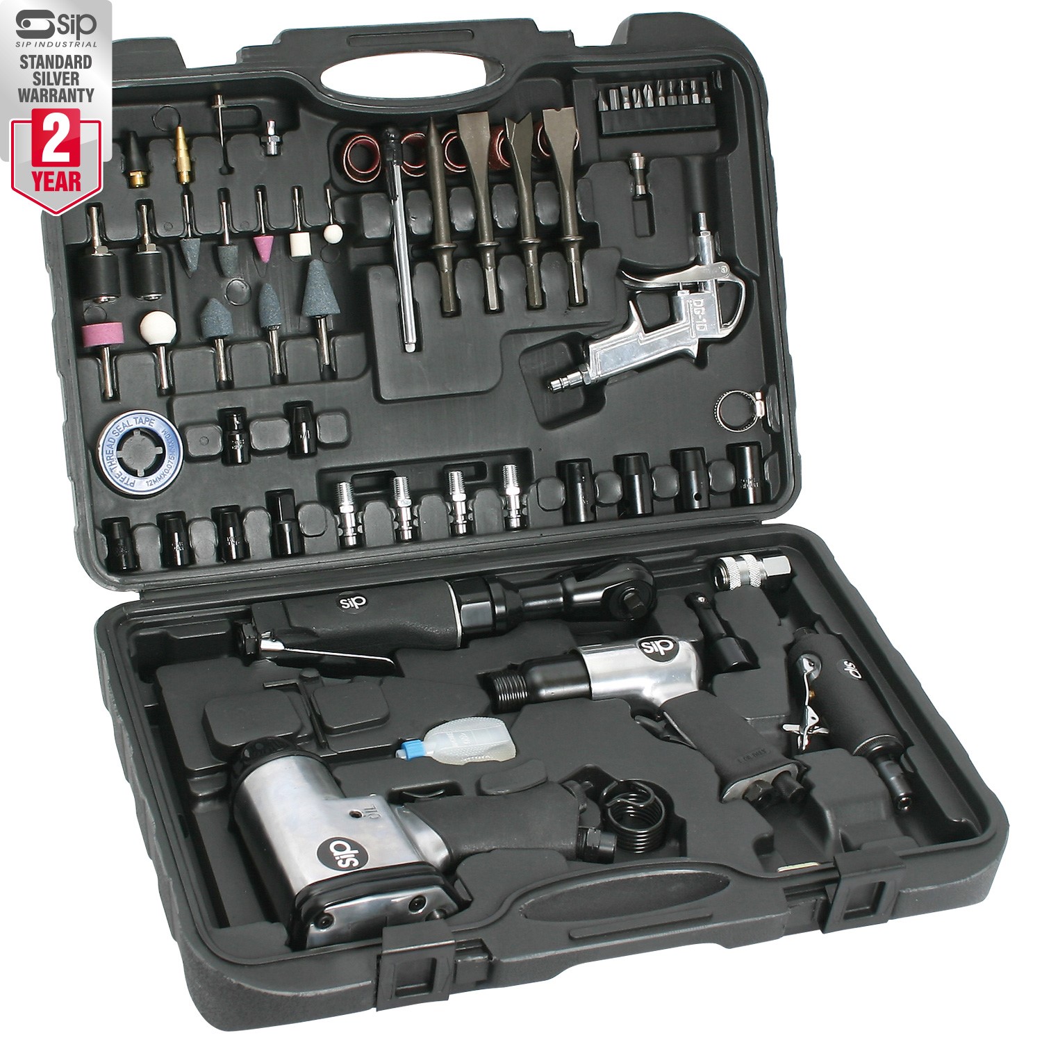 The SIP 73pc Air Tool Kit is a comprehensive kit that features four heavy-duty SIP Air Tools and a range of accessories and consumables that perfectly complement them, ensuring that the user has everything required to get the job done in a range of applications in garage or workshop environments.