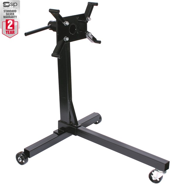 The SIP 750lb Engine Stand is designed to support and hold a wide range of engines and gearboxes securely during common automotive maintenance and repair applications, and is perfect for various workspaces including garages and workshops.
