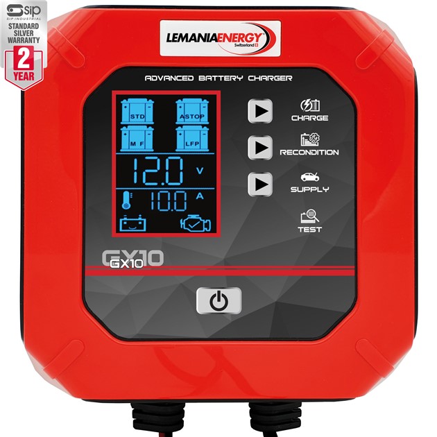 The SIP Advanced Battery Charger GX10 is the ultimate tool for charging, support, and diagnostics, combining intelligent charging, maintenance, supply, and more into a simple process with Lead Acid, SLA, AGM, GEL, WET, VRLA, CaCa, EFB, and LiFePO4 batteries.