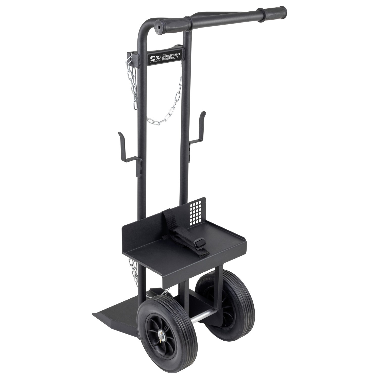 The SIP Large Cylinder Welding Trolley is compatible with the SIP AUTOPLUS ECO 200 (05723) and SIP AUTOPLUS ECO 180 (05724) MIG Inverter Welders, holding larger gas cylinders up to 99kg in weight on the rear-facing footplate.
