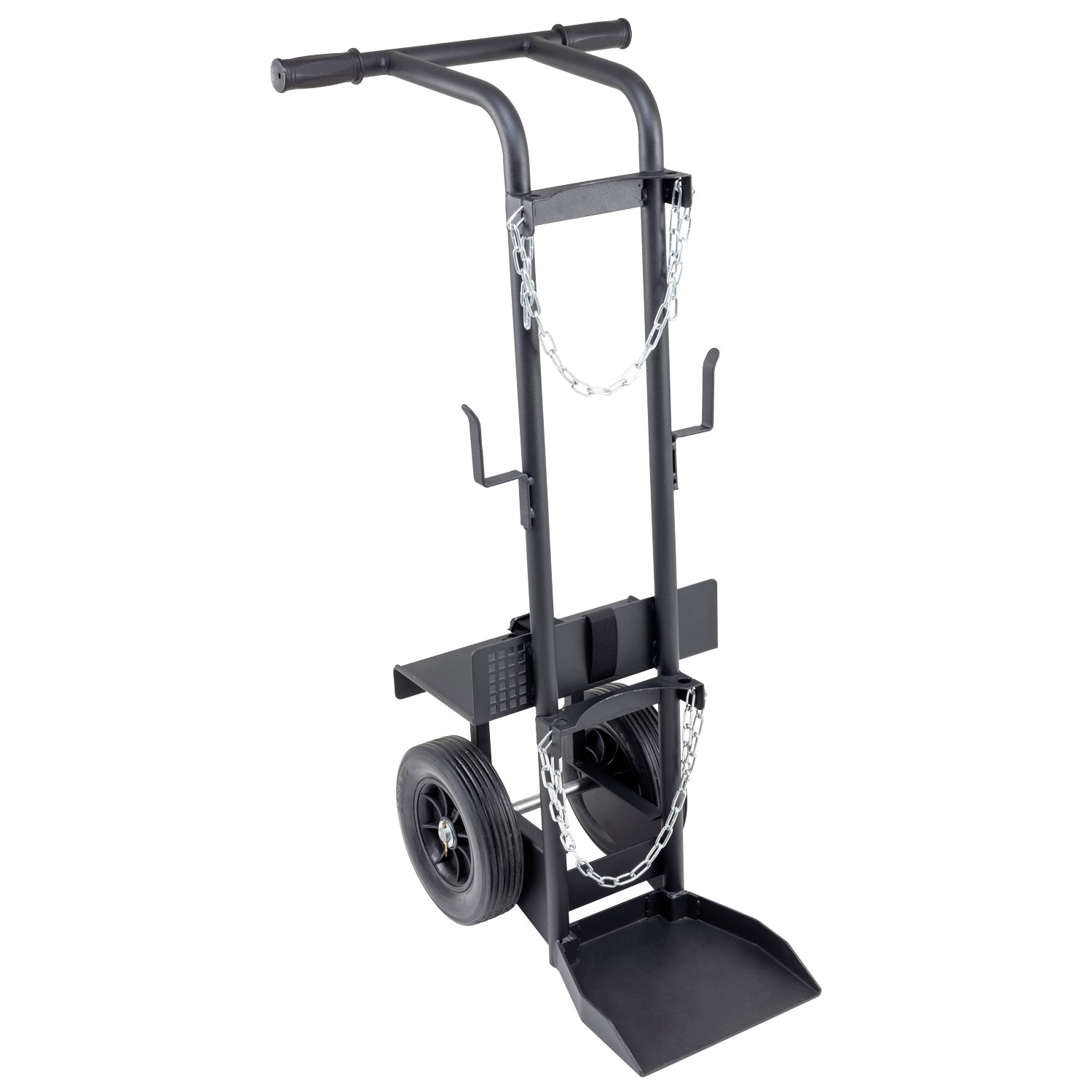 Cylinders can be secure at two points on the trolley via robust pull-through chains, while large solid wheels ensure great movability around the workshop.
