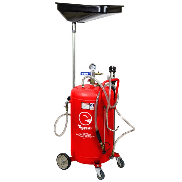 The TIGREN 70ltr Suction Oil Drainer effortlessly collects waste oil from engines and gearboxes via a large 70ltr heavy-duty steel tank and 10ltr collection tray despite a compact physical footprint. A wheel-mounted design offers easy positioning.