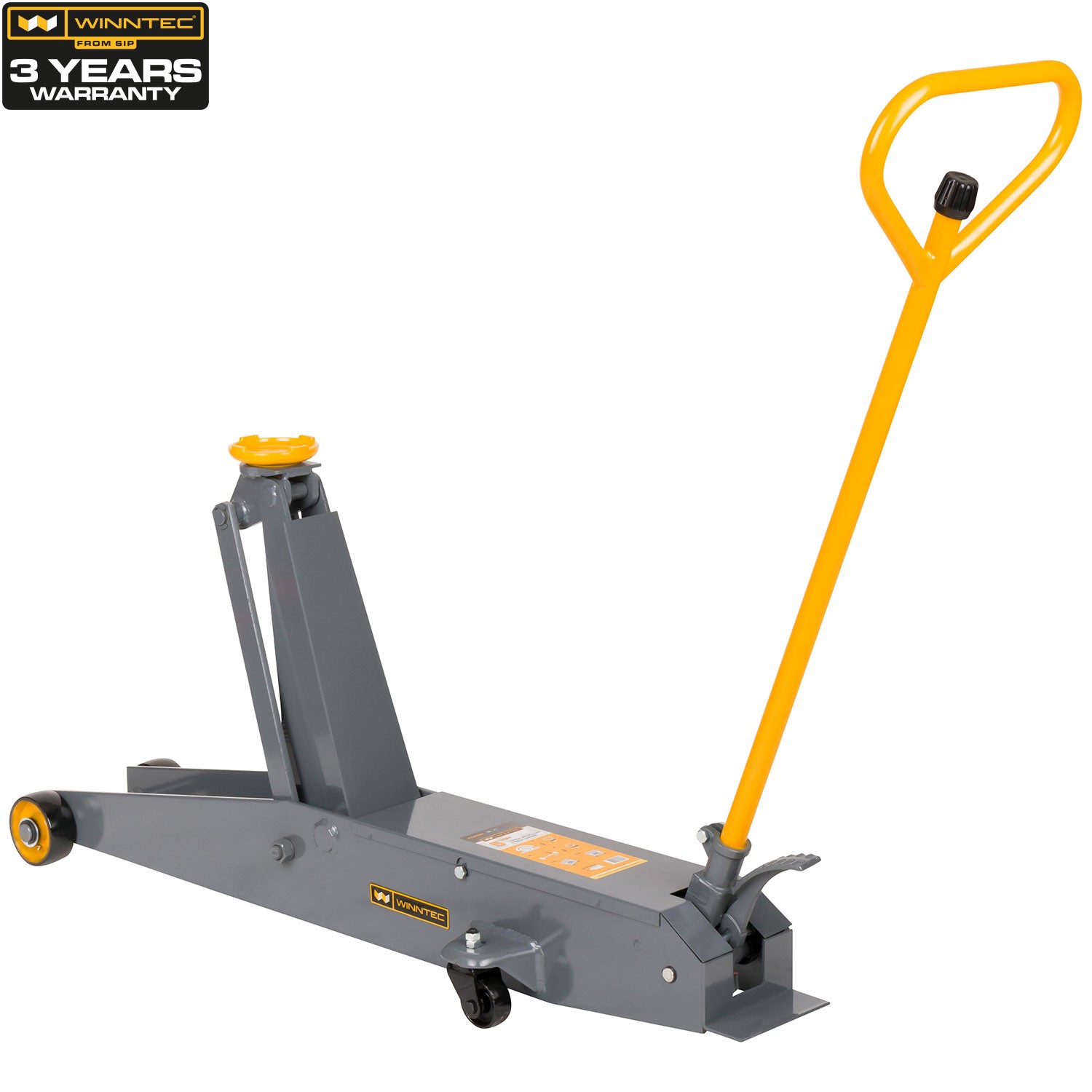 The WINNTEC® from SIP 10 TON Long Chassis Jack is perfect for extreme lifting of trucks and heavy machinery, offering high-reach performance from a low-profile design and exceptionally safety usage via automatic overload and universal joint release valves.